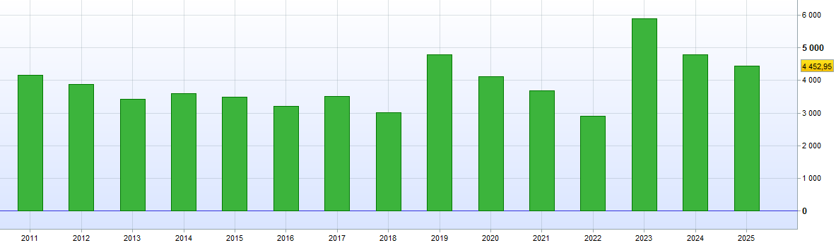 The best year was 2023 with almost 6000€ in profits (biggest gains often comes after biggest loses).