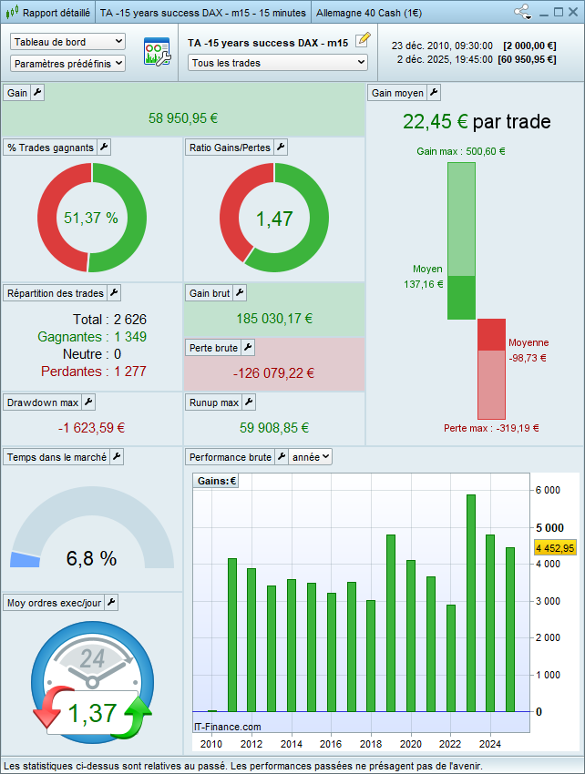 The starting capital is 2000€, with a constant risk of 100€ per trade (5% of initial capital), gains not reinvested.
