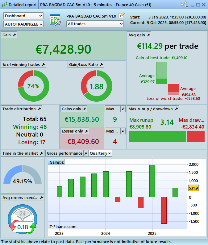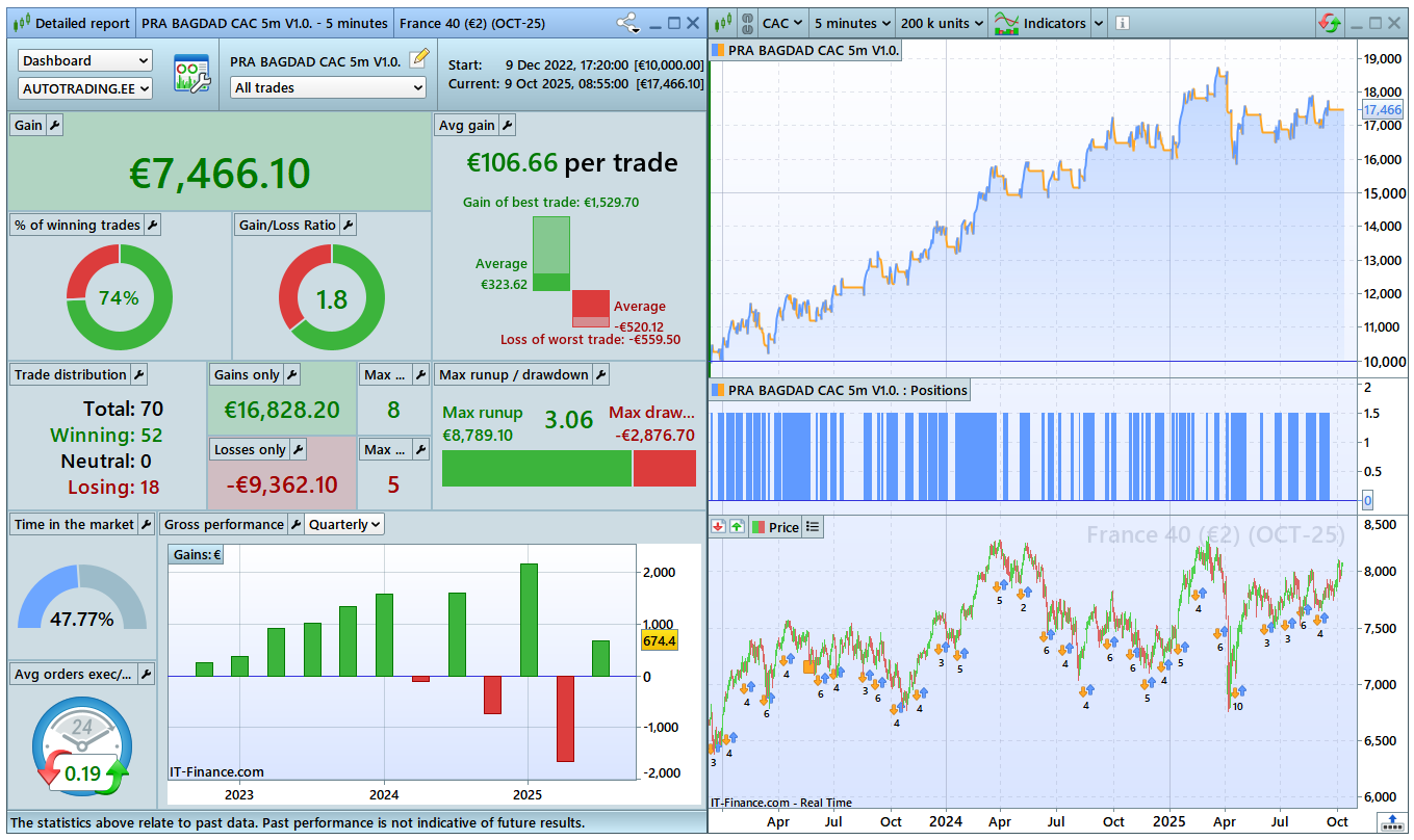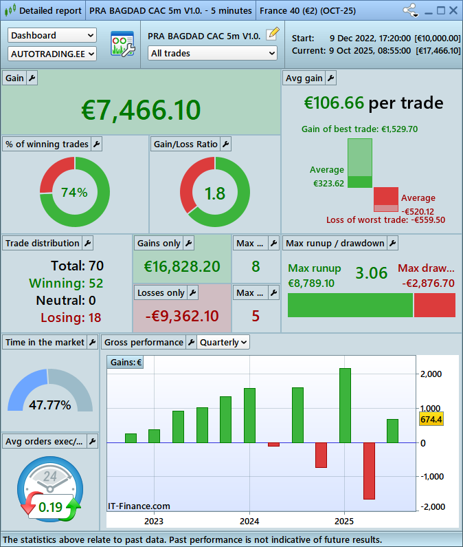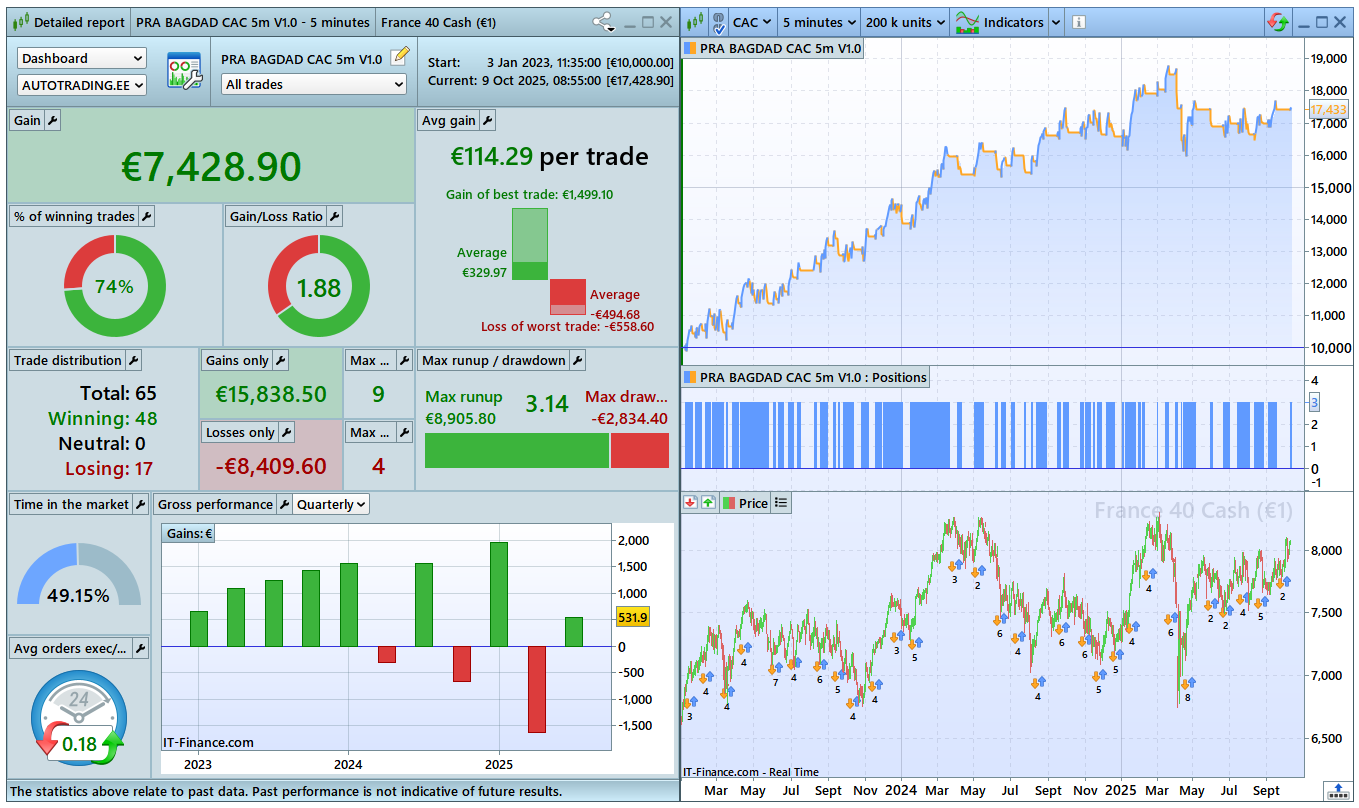 The base strategy was developed for different markets at a customer’s request. Finished on July 17th 2023, for CAC was performing so well. Finally launched ending 2023 / starting 2024 under ProRealAuto vendor name (ourselves too). Now, we add this system in the CFD AutoTrading catalogue after numerous requests to add diversification to our TOTAL PACK. See the original product page in this marketplace here.