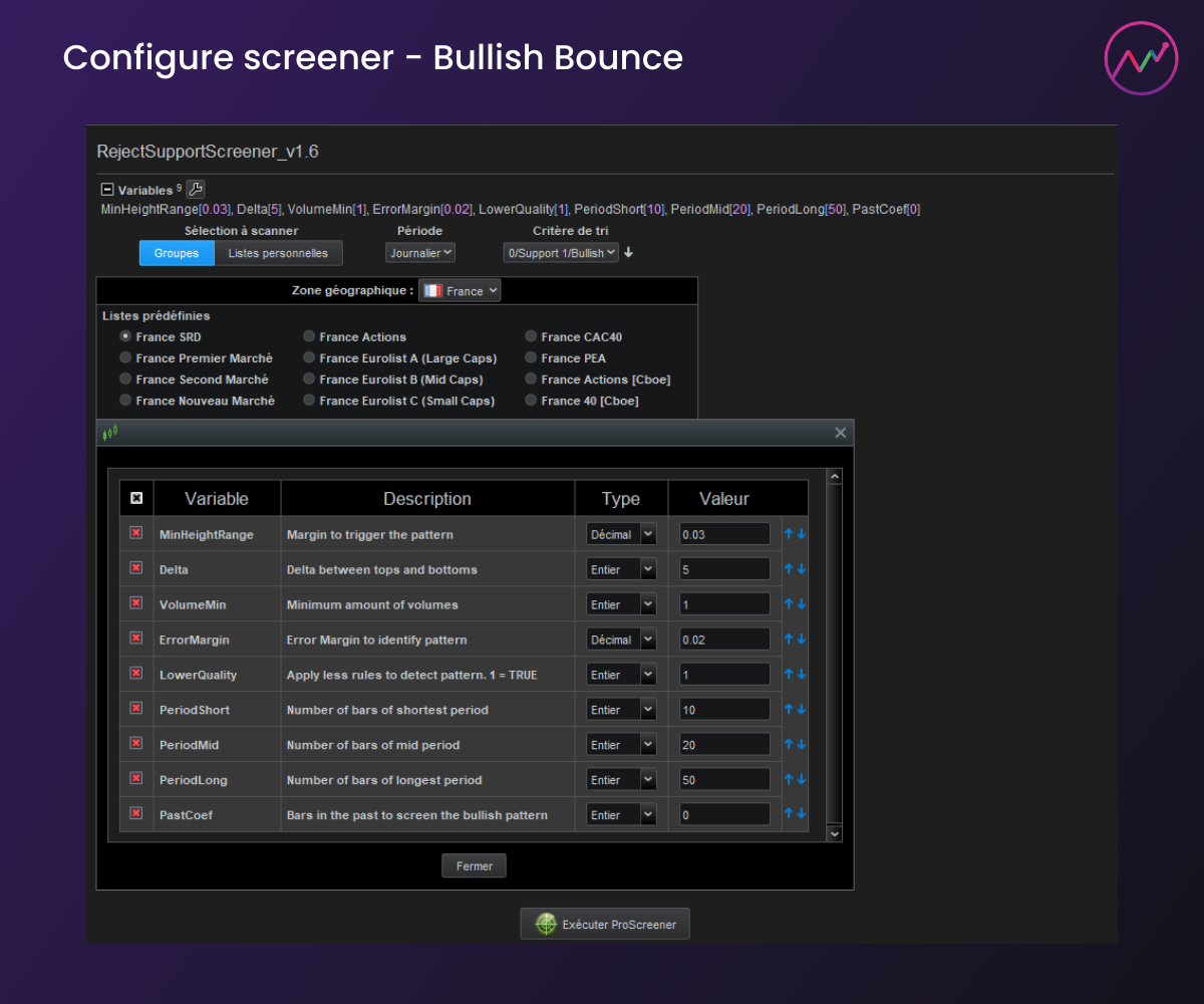 - Screener – The Bullish Bounce Screener performs a broad scan of the market, detecting all possible support levels and ensuring a comprehensive search for bullish bounce opportunities. It then filters the best setups where price is interacting with support and forming bullish reversal signals, maximizing your chances of finding high-probability trades.