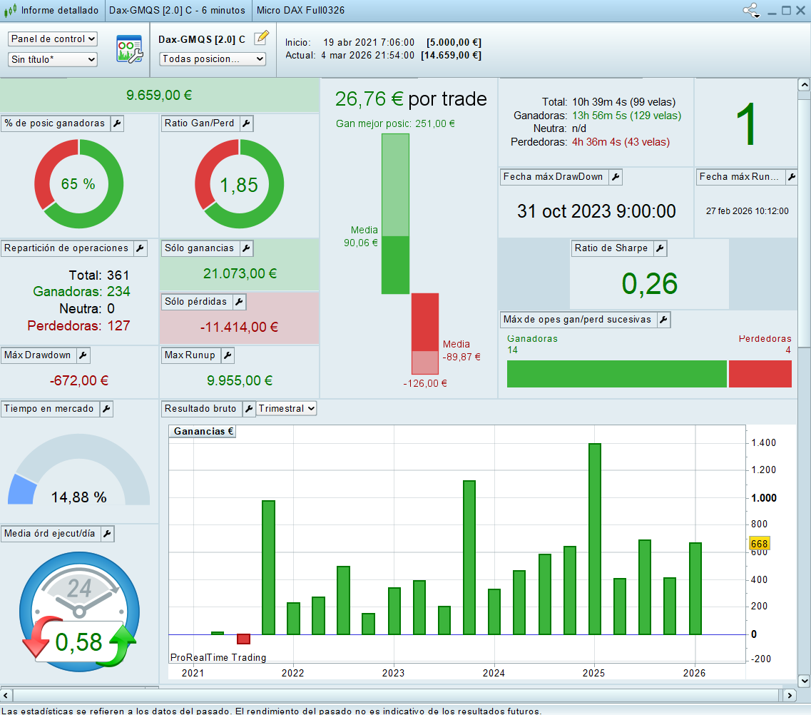 GMQS MICRO DAX is an automated long-only intraday trading strategy designed to trade the Micro DAX on 6-minute charts using ProRealTime Trading with Interactive Brokers.