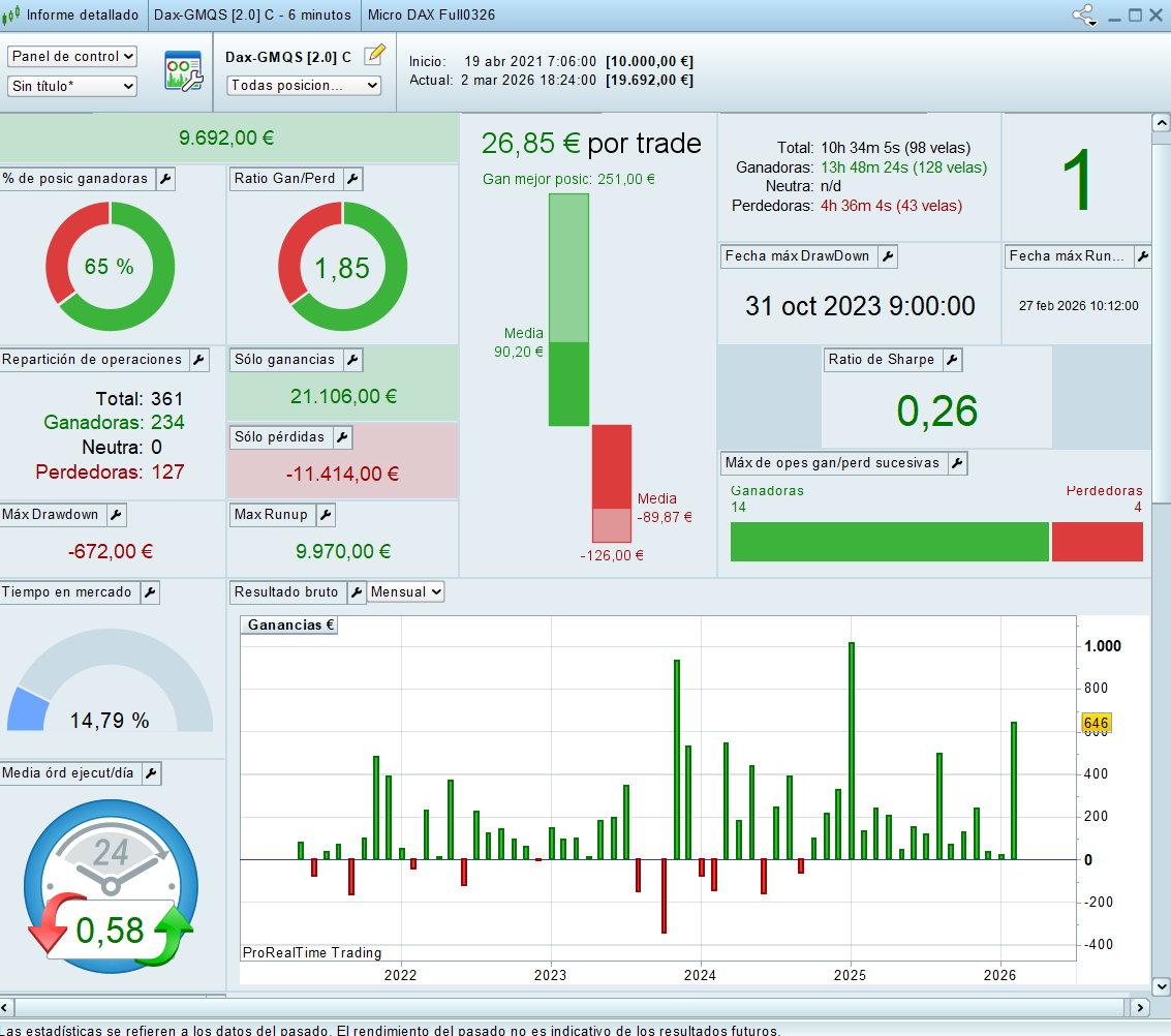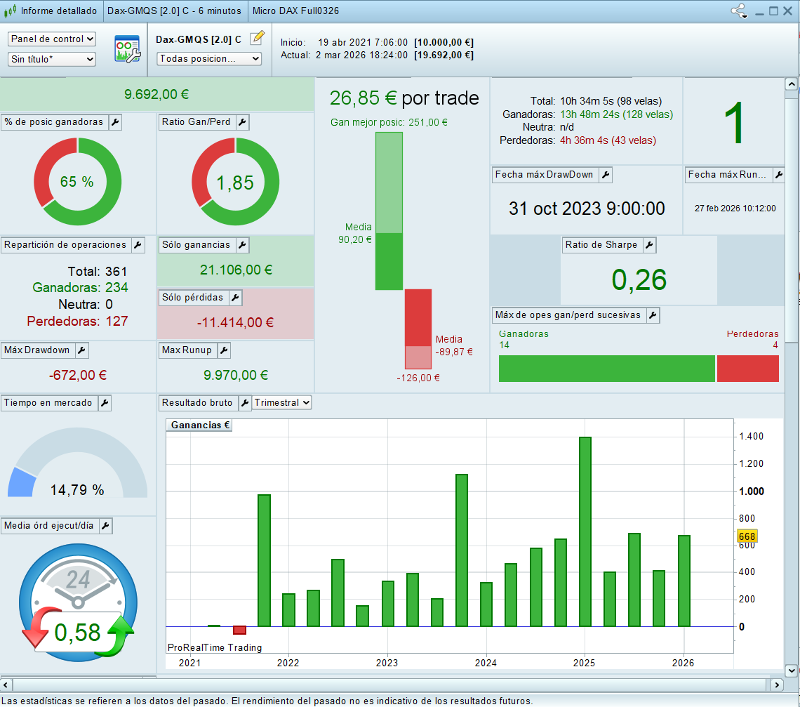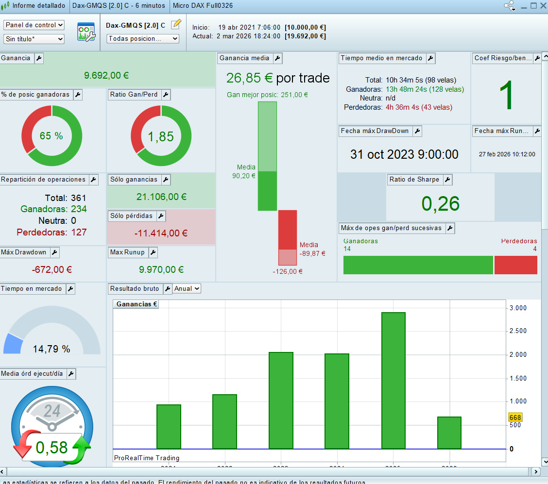 GMQS DAX is an automated long-only intraday strategy designed to trade the Micro DAX on 6-minute charts.