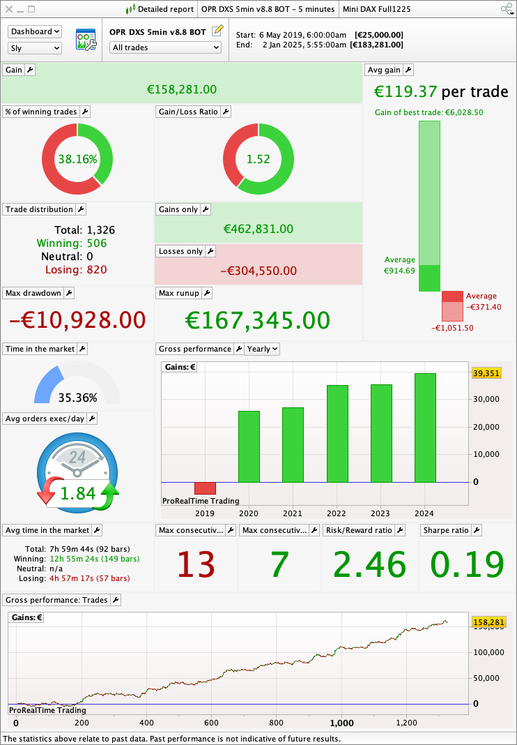 The trading system was designed, developed and optimised over a period of nearly 6 years (06/05/2019 – 16/03/2025) to obtain a robust long-term system capable of coping with different market conditions (range, bullish, bearish, volatility, etc.).