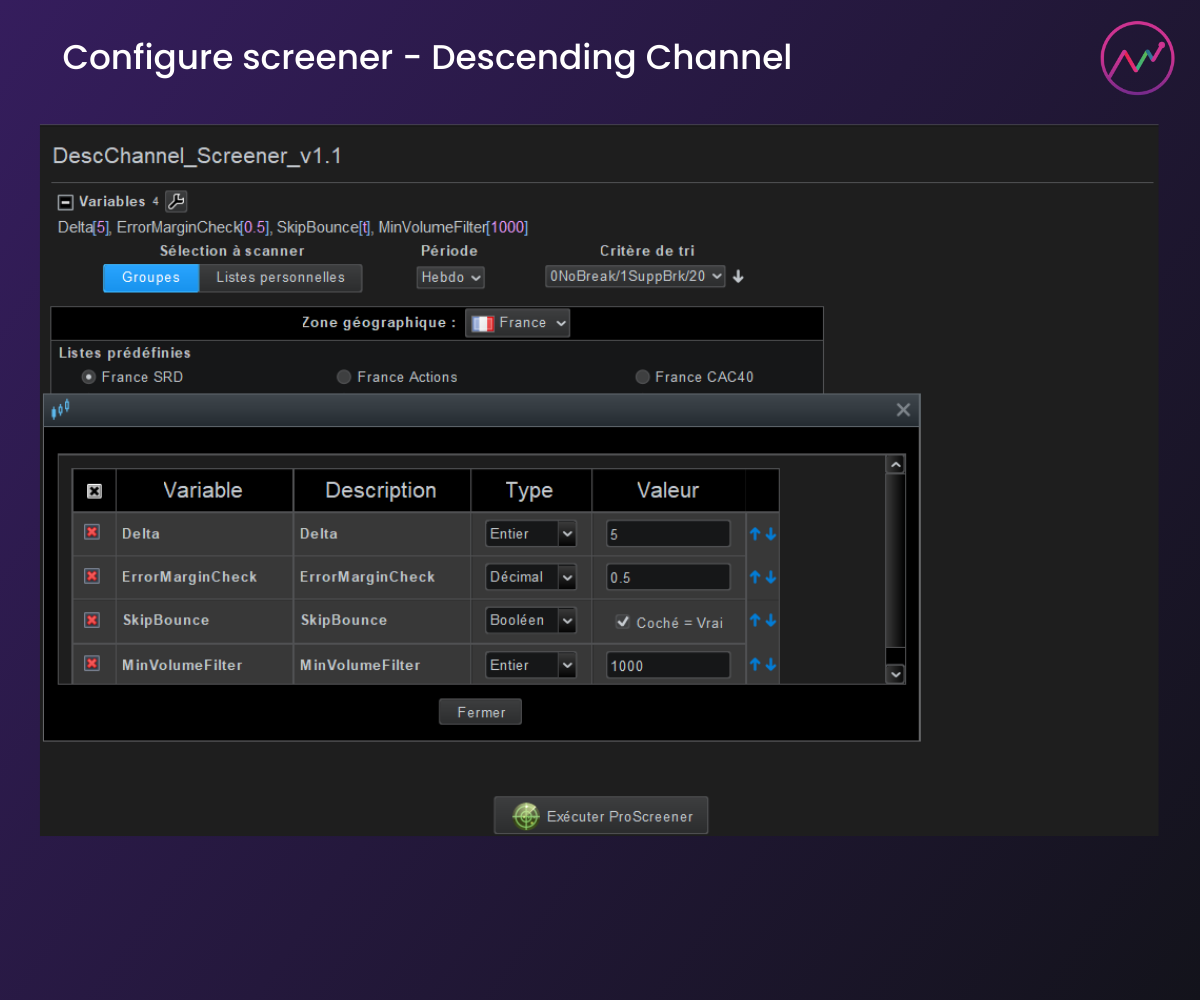 - Screener : Lancez le screener pour scanner rapidement le marché à la recherche d’actifs qui répondent à vos critères prédéfinis basés sur la formation du canal descendant. Identifiez les meilleurs actifs en quelques secondes.