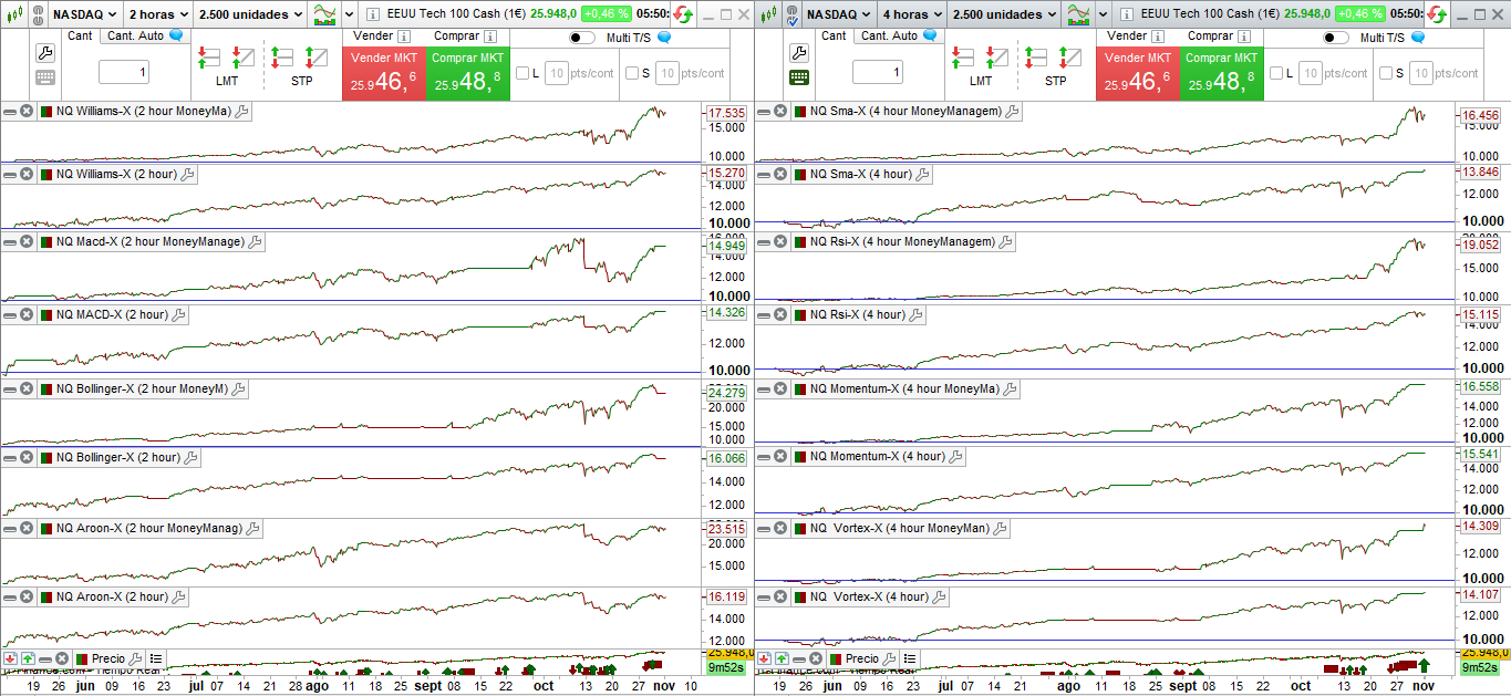 Every algorithm functions as an independent analytical entity. Some modules focus on momentum expansion, others on trend persistence, volatility reversion, or volume-driven breakouts. Collectively, they form a multi-indicator behavioral framework capable of reproducing, in algorithmic form, the internal rhythm of the Nasdaq market.