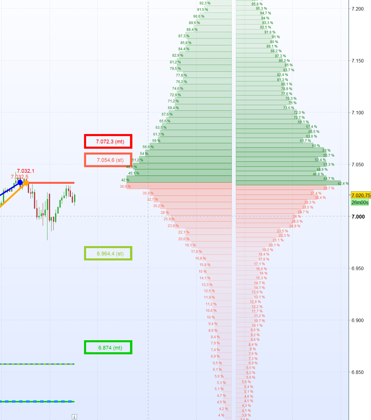 - Clarity on Trend Status: The system definitively determines the current market trend (bullish, sideways, or bearish). Critically, it also calculates and displays the precise price level that would signal the end or breakdown of that trend, giving you clear lines in the sand, as well as the probability for each of the trend scenarios updated in real time.