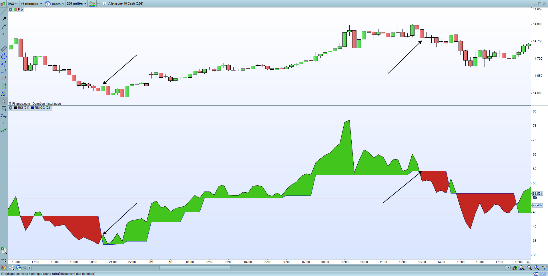 This indicator shows the RSI indicator accompanied by a trend line. Their intersection offers a surgical opportunity to enter and exit the market.