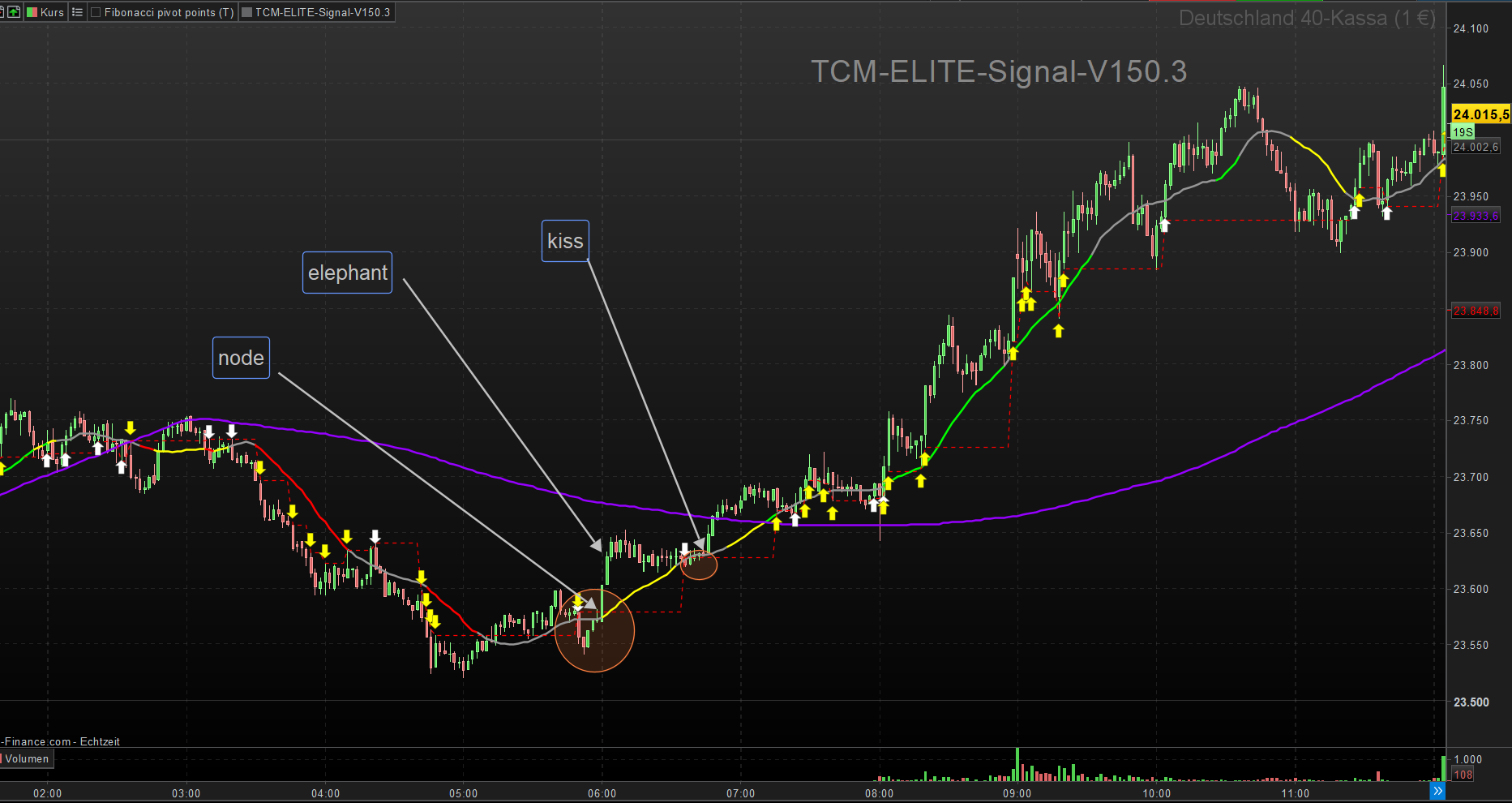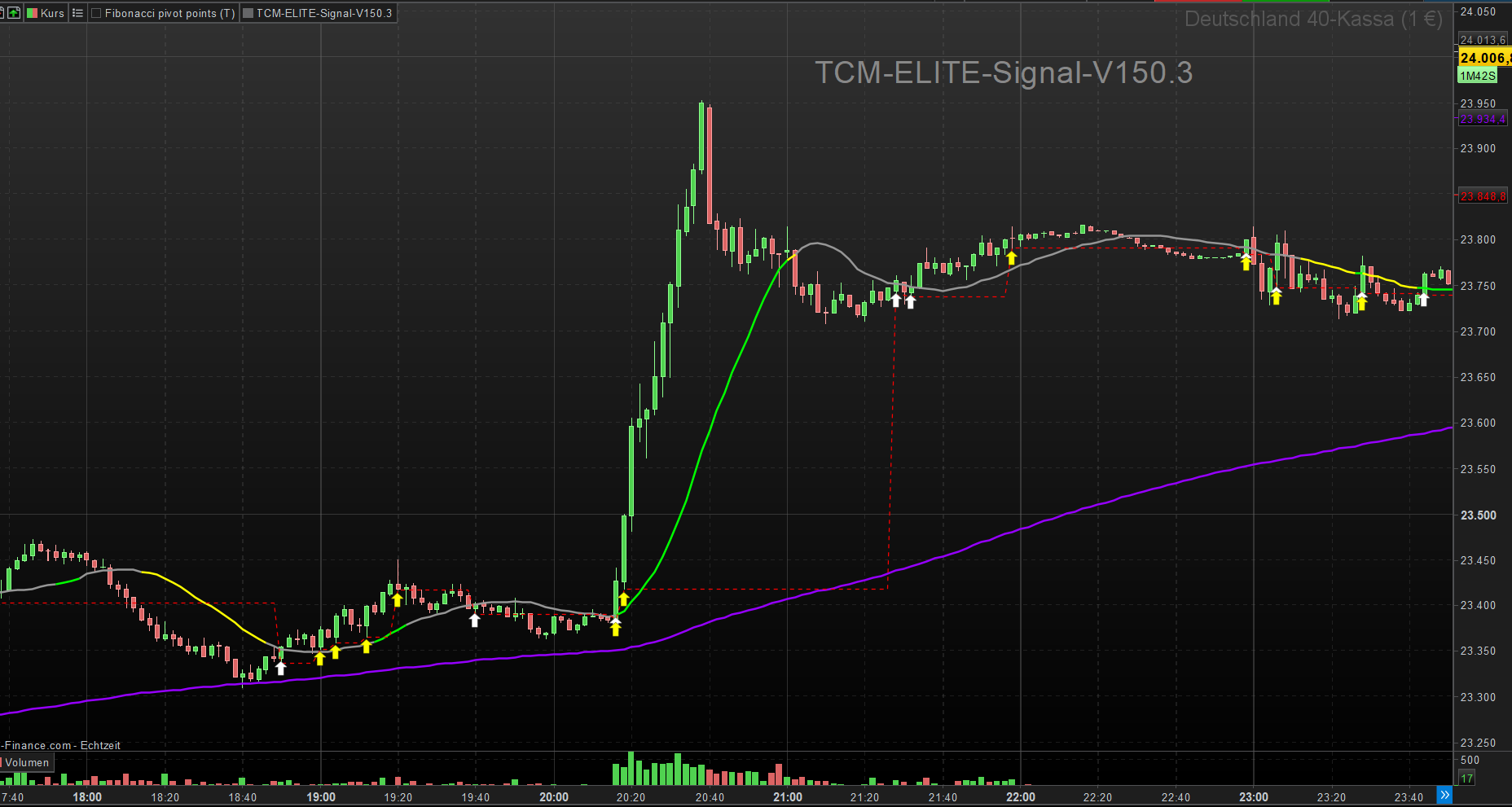 The TCM V150.3 was specifically developed for the volatility of the DAX (2-Min / 5-Min). It helps you avoid dangerous sideways phases and instead allows you to follow the footprints of “Smart Money” players.