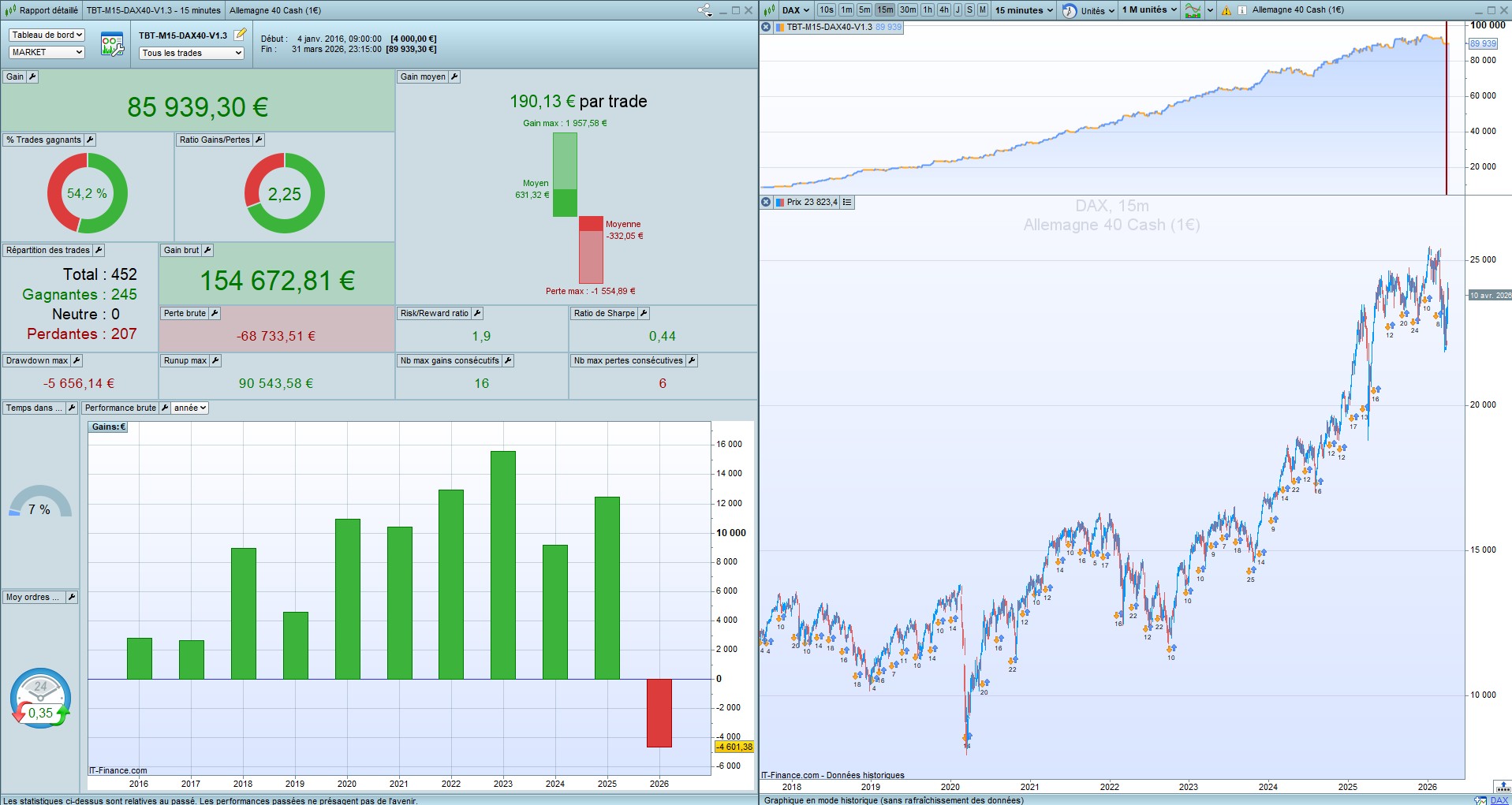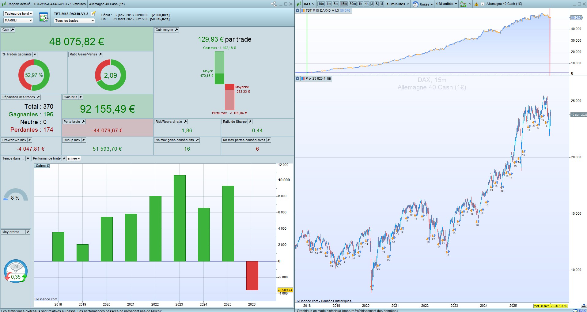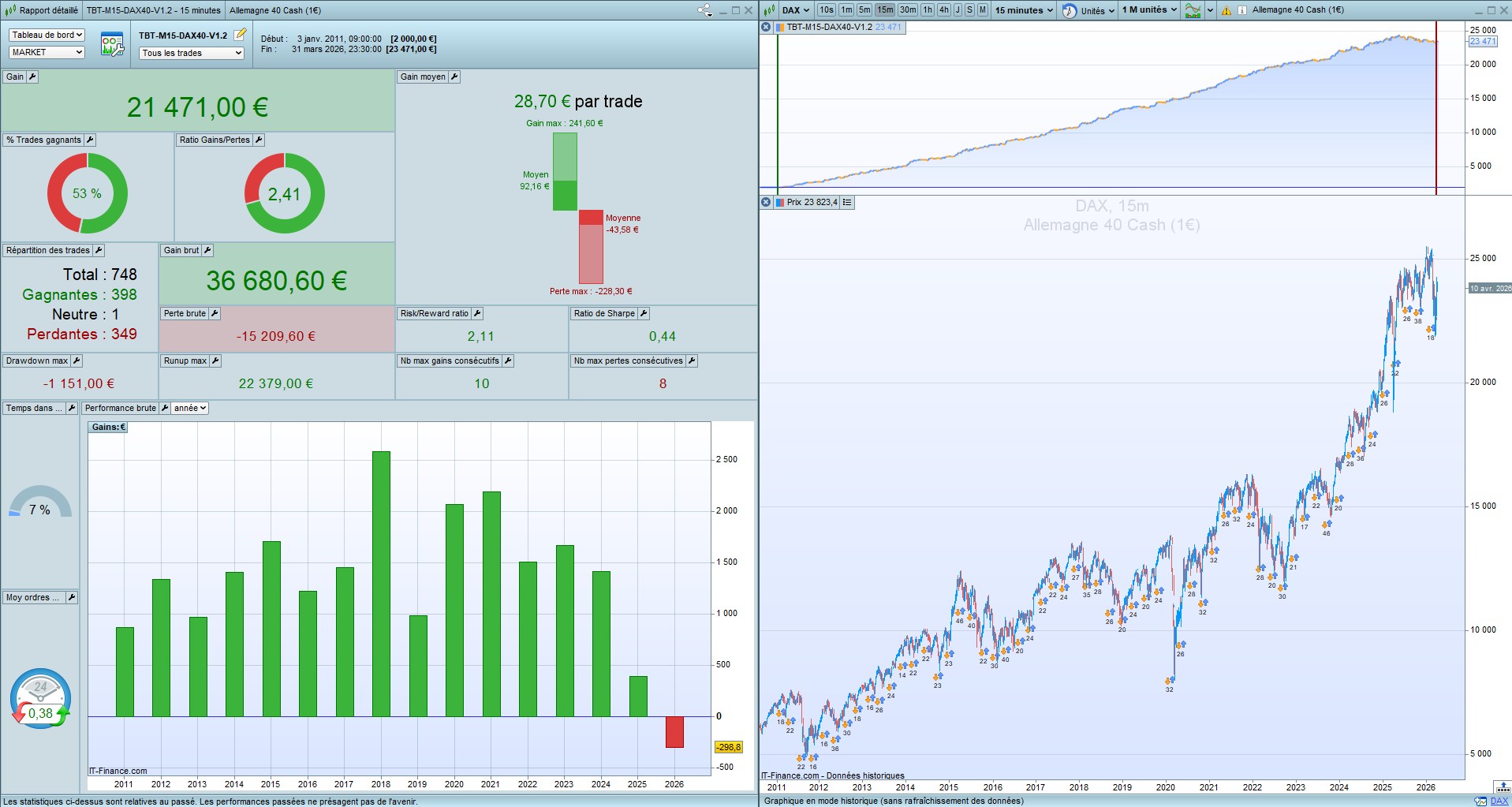 Backtest V1.2 : 1 contrat, DAX 40 (1€/point), spread 2, sans réinvestissement (mise à jour au 31/03/2026)