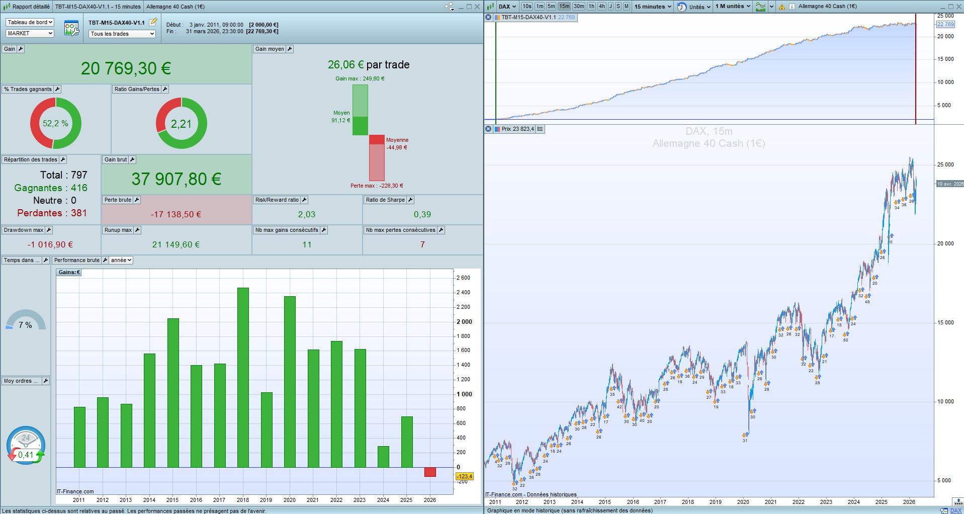 Backtest V1.1 : 1 contrat, DAX 40 (1€/point), spread 2, sans réinvestissement (mise à jour au 31/03/2026)
